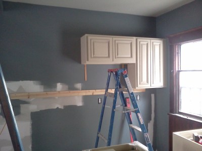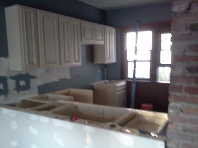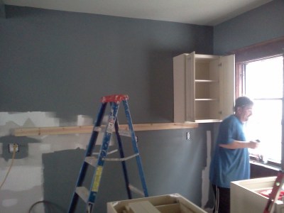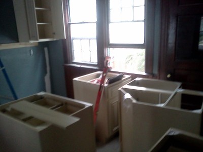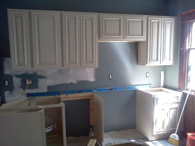 I had taken 2 half days and a full day off this week to get some work done in the new house. This would also allow me to work with Al (our contractor) to learn some things. The heat wave hasn’t made things very easy on us but we were determined to make some good progress. We got all of the cabinets put together on Monday and Tuesday. Wednesday we put them up. We love the way they look in the kitchen. When they were on display in the store, we were sort of on the fence about them.