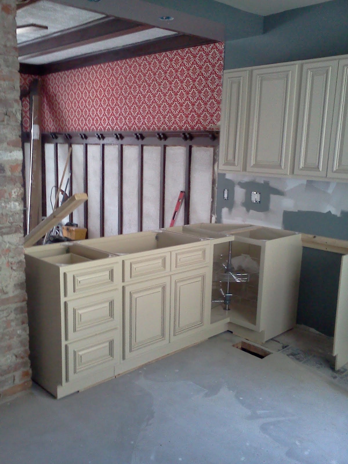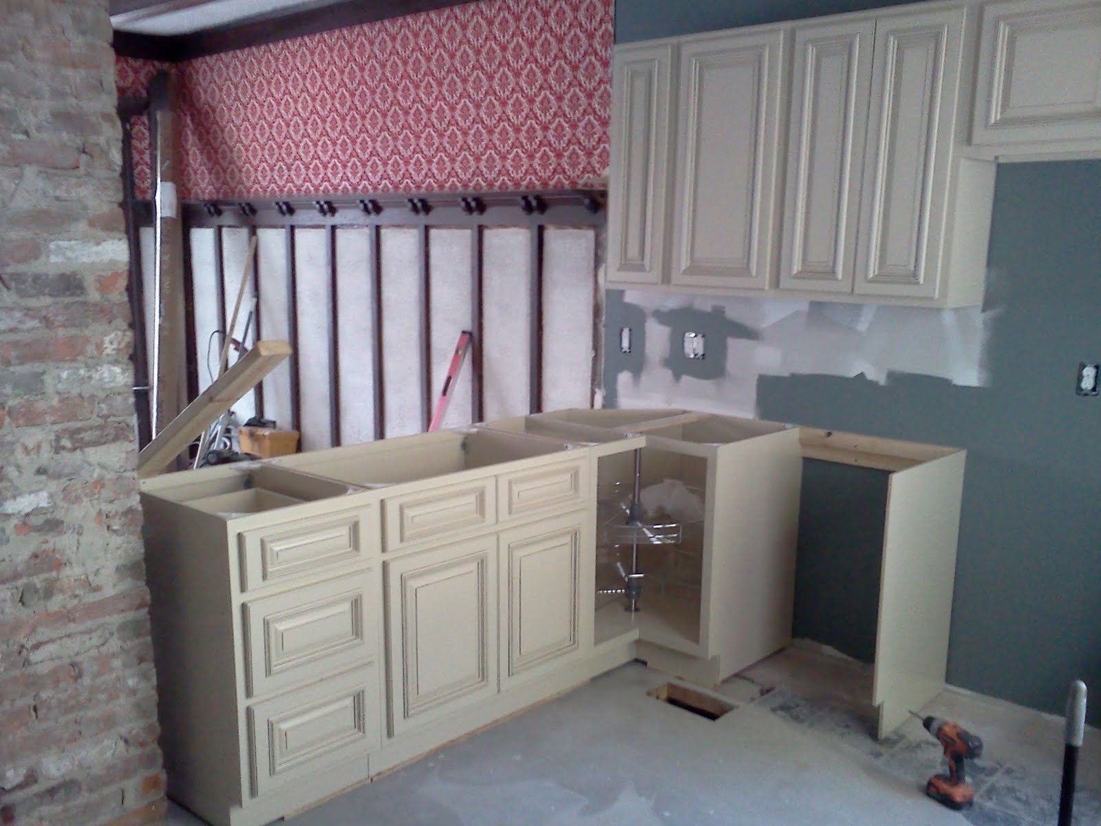 I had taken 2 half days and a full day off this week to get some work done in the new house. This would also allow me to work with Al (our contractor) to learn some things. The heat wave hasn’t made things very easy on us but we were determined to make some good progress. We got all of the cabinets put together on Monday and Tuesday. Wednesday we put them up. We love the way they look in the kitchen. When they were on display in the store, we were sort of on the fence about them.