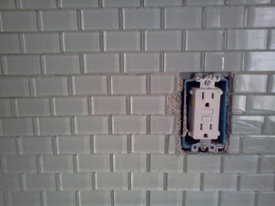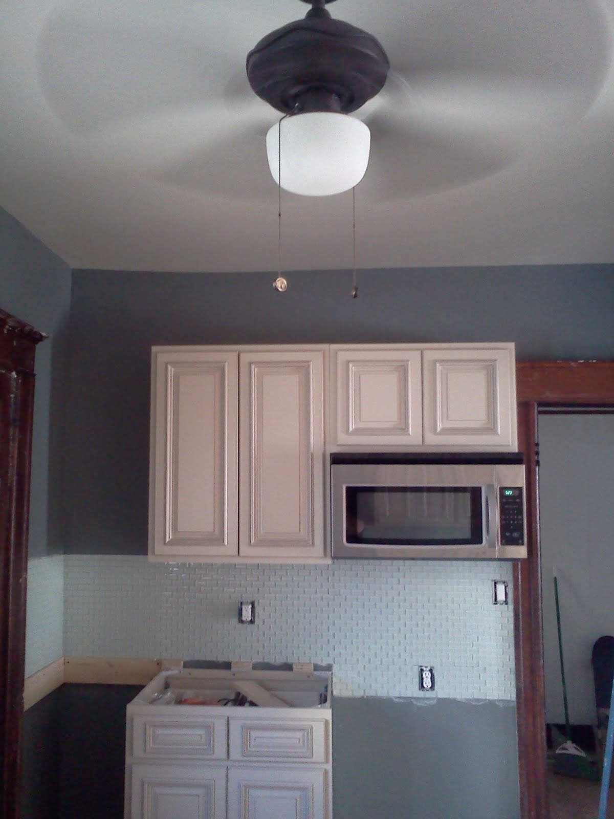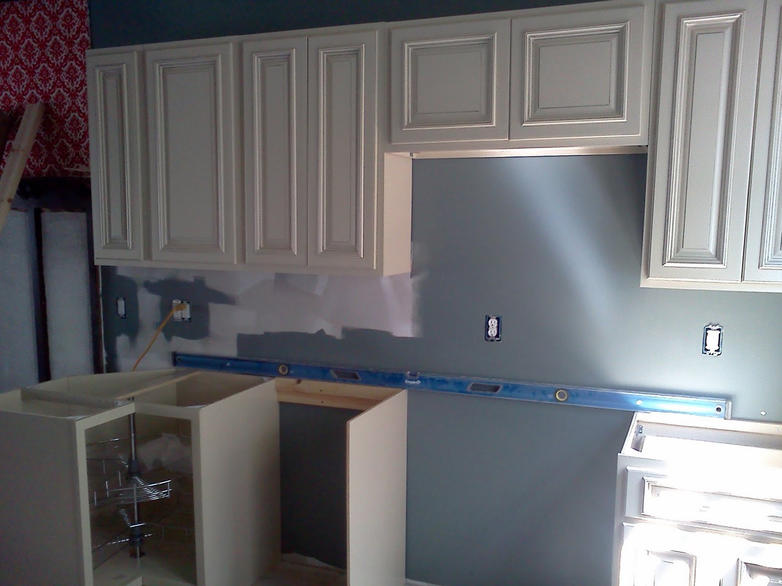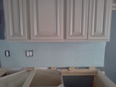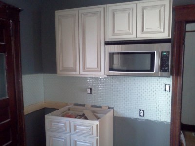 The back splash on both sides of the kitchen is now finished. Al finished the other wall today and installed the rest of the remaining cabinets that we had to get shipped because the originals that we ordered were cracked. Now all of the cabinets and the back splash are up, along with the microwave. Next up is the floor and ordering the granite. We cannot wait to get the appliances moved in.