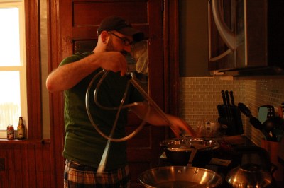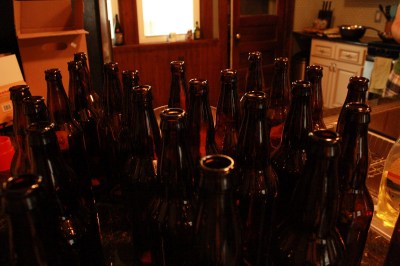 | After a while, I got the hang of it and set up a little bottle stand. This allowed me to cap while the siphon slowly filled the bottles. |