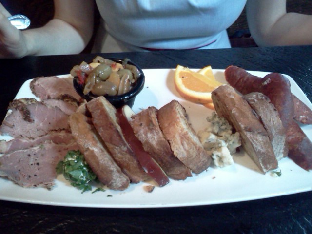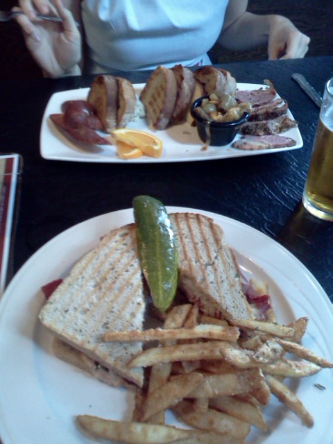 Her dish was an amazing spread of Hungarian hot sausage, Smoked Eye of Round, Mackenzie Creamery Chevre, Knight’s Vale Smoked Gouda, Seymore Dairy Aderkase Blue Cheese, Seasonal vegetables from their “pint sized farm,” and brewers barley bread crostini. It was totally awesome. My sandwich was also really good.