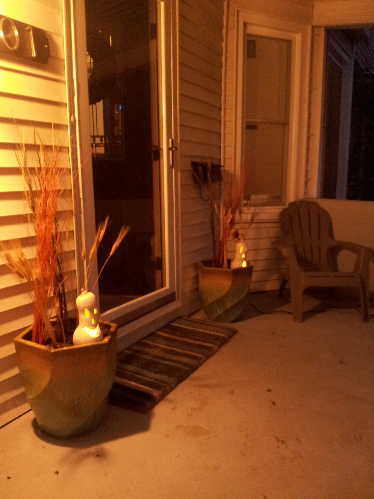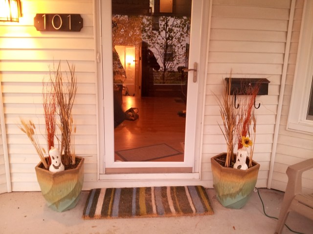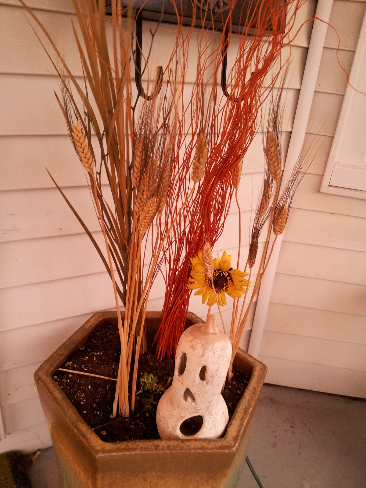 We had two planters that we had some fall Mums in, but we did something wrong and the Mums died. According to numerous sources, it was hinted that you have to be a complete idiot to kill Mums…..we managed to. So Nicole yanked them out, and we were able to create little Halloween themed planters!