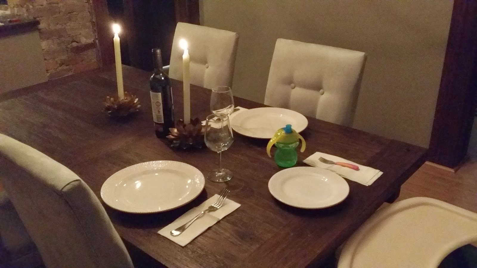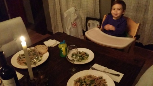 In the end you have 2 people coming home who have been gone all day, tired, strung out, and itching to get into something comfortable to relax. Part of the fun in having a little kid, is surprising them. Sure, she doesn’t know what a candle light dinner is…but she knows it wasn’t like normal dinner, and we certainly don’t light fancy candles! She seemed to love it and had two whole plates of pasta with nothing but grins. I love my family.