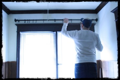 Nicole and I took off Monday because neither of us felt like working after the Royal Rumble party. What a perfect day to complete a project. A few weeks ago, Nicole had ordered some fabric online for some curtains she was planning on making for the second floor landing. Curtains can be really expensive depending on what you want, we figured we would make them ourselves and get exactly what we want for a fraction of the cost.