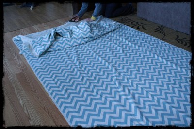 | We needed a big space to spread the fabric out so we moved the couch and made our measurements marking the floor with white tape so that it was easy to identify the marks for cutting. |