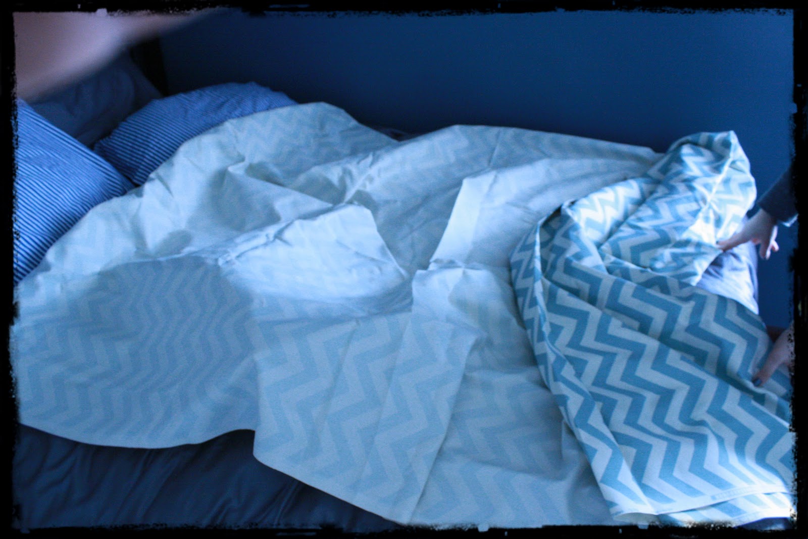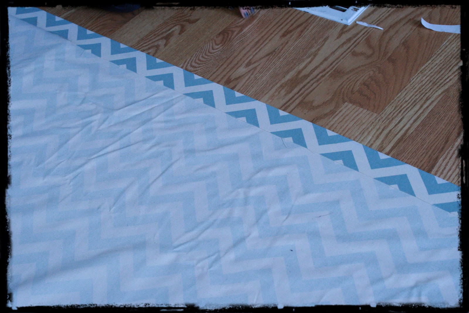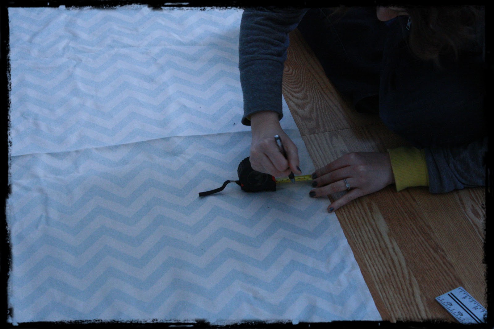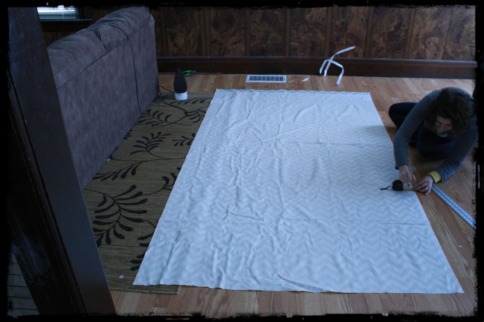 | We needed a big space to spread the fabric out so we moved the couch and made our measurements marking the floor with white tape so that it was easy to identify the marks for cutting. |