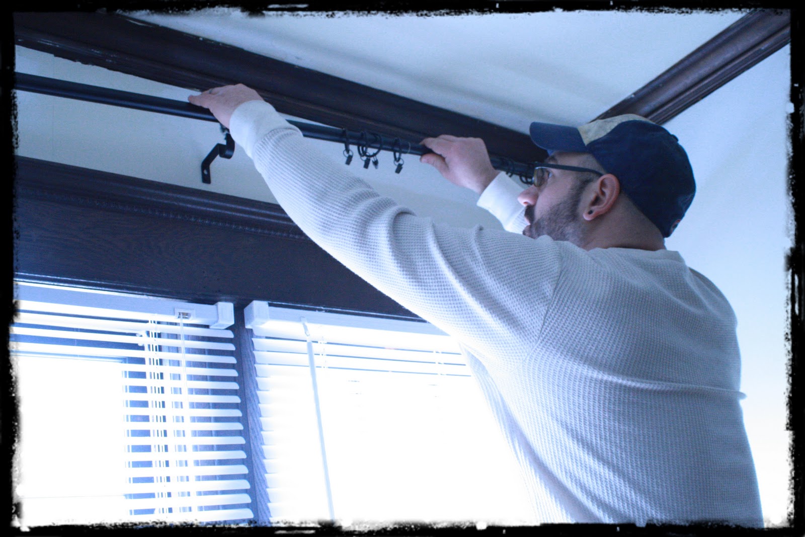 Nicole and I took off Monday because neither of us felt like working after the Royal Rumble party. What a perfect day to complete a project. A few weeks ago, Nicole had ordered some fabric online for some curtains she was planning on making for the second floor landing. Curtains can be really expensive depending on what you want, we figured we would make them ourselves and get exactly what we want for a fraction of the cost.