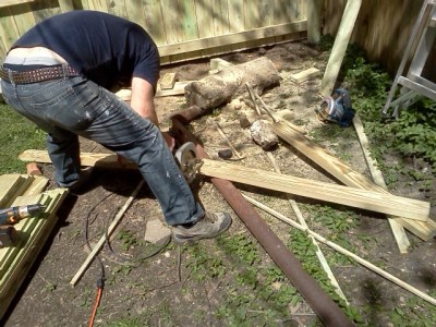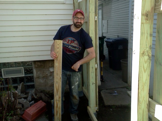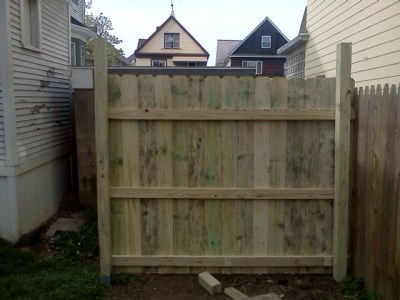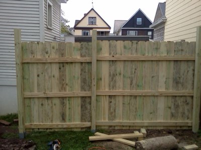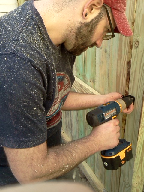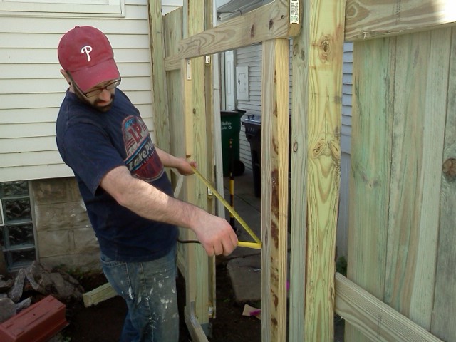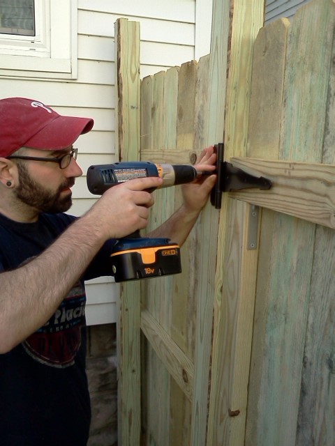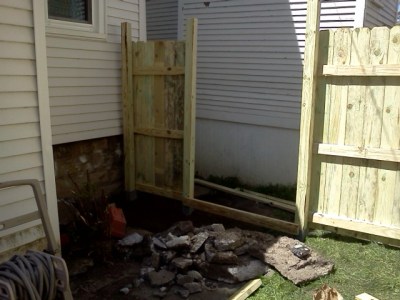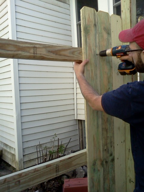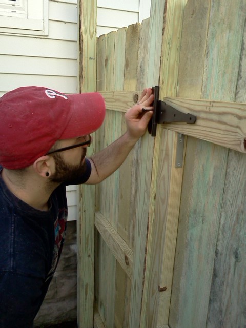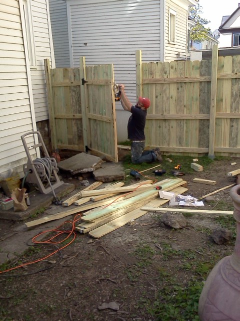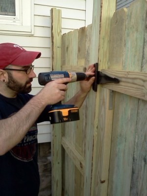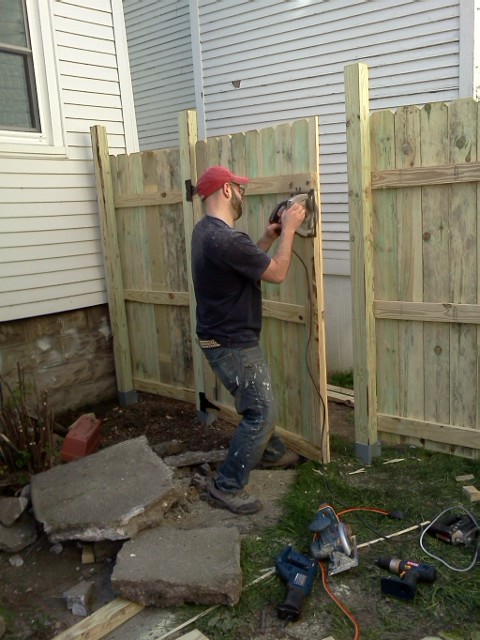 This weekend was big in terms of production.  Nicole and I set out to “start” the fence, but ended up going balls out and finished almost all of it.  There is just a small section on the other side of the yard to complete but the majority, the large side, is now finished.  We had never really done anything like this, so it was a totally fresh experience.  I have to say, it went as smooth as it could have possibly gone.  I started putting the posts in, while Nicole blasted the concrete blocks with a sledge hammer that were remaining from the original patio walkway that came with the house.  It was super thick so this was the only way.  The rest of the process was pretty easy.  We didn’t have to use a post digger, home depot sells these 3 foot spikes that the beams set into and then you bolt them in place.  They are heavy duty and sort of expensive, but they made things pretty easy and we only needed a few.  We used 2×4’s to go across the fence.  I saw a guy at Home Depot who was also getting fence supplies, he suggested using them over anything else for the strongest, best quality build.   Putting the actual fence portion up was not really the challenging part.  The hardest part was creating the gate door.  I was able to YouTube a video that Lowes had created about how to build a gate.  It gave me some really good pointers and suggested that you build the gate right onto the fence, then once its built, you saw off the extensions that were holding the gate to the fence.  I still had some issues and needed to shave down the door a bit to get it to comfortably close.  In the end, gate came out nice, and its super heavy.  Phase 1 of our back yard transformation is now just about complete!