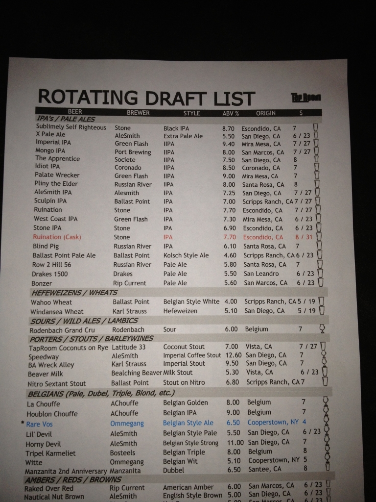 My stepfather and I went out one night after the ladies were asleep in search of a beer oasis. We found it at the Taproom. Let me start by saying, that if you are on the West Coast, you should be constantly searching for Russian River’s Pliny The Elder. I won’t even go into detail about it….if you are into craft beer….do some research. Needless to say, we were lucky enough to run into a freshly tapped barrel which they get only once a week, and gets kicked in a little more than a day. It’s easily a top 5 IPA of all time. I had one of those, along with Russian River’s “Blind Pig” which is an IPA, and then Stone’s Ruination on Cask. The Ruination on Cask was like liquid gold. If you don’t appreciate cask beer, then you can’t say you are a fan of beer. With a cask beer, you taste beer in its purest form. If you think of it as just “flat beer”, than you failed to grab the pebble from the master’s hand. You fu*king failed to capture a fly in the chop sticks and sure as shit didn’t perform the crane kick from a stoop. The Ruination Cask was sick, and was the best beer I had while in San Diego (so far, I have yet to reach Stone!).
