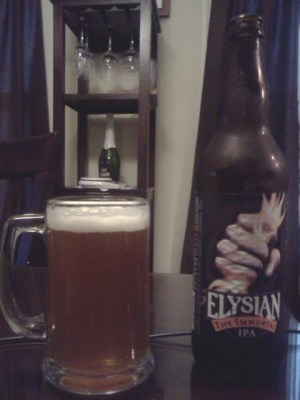 Last night’s beverage of choice was the Elysian “The Immortal” I.P.A. from the Elysian Brewing Company out of Seattle, Washington. I picked this up with a few other bottles at the Village Beer Merchant here in Buffalo. I’ve decided that I’m going to review up to four beers a week. Next week I’m off to San Fransisco where I will be taking note of plenty incredible beers that I will be encountering on the west coast.